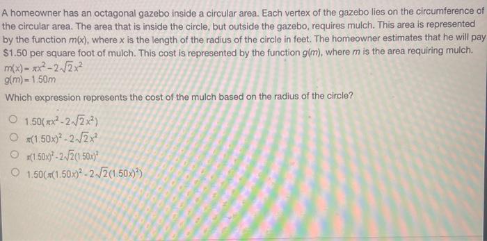 . A homeowner has an octagonal gazebo inside a circular area. This area is represented by the function m x where x is the length of the radius of the circle in feet. This area is represented by the function mx where x is the length of the radius of the circle in feet.